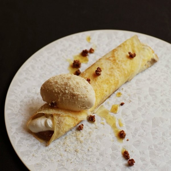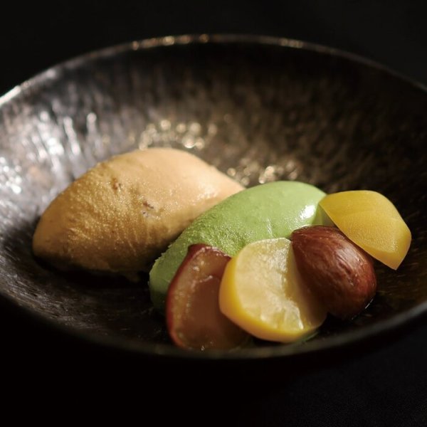 当店自慢のスペシャリテ。お客様の目の前で、丹波栗を贅沢に使用したモンブランクリームをたっぷりと絞り上げます。生クリームの滑らかな口当たりと、濃厚な抹茶アイスのほのかな苦み、サクサクとしたカダイフの食感が絶妙なバランス。五感で楽しむ、まさに至高の逸品です。