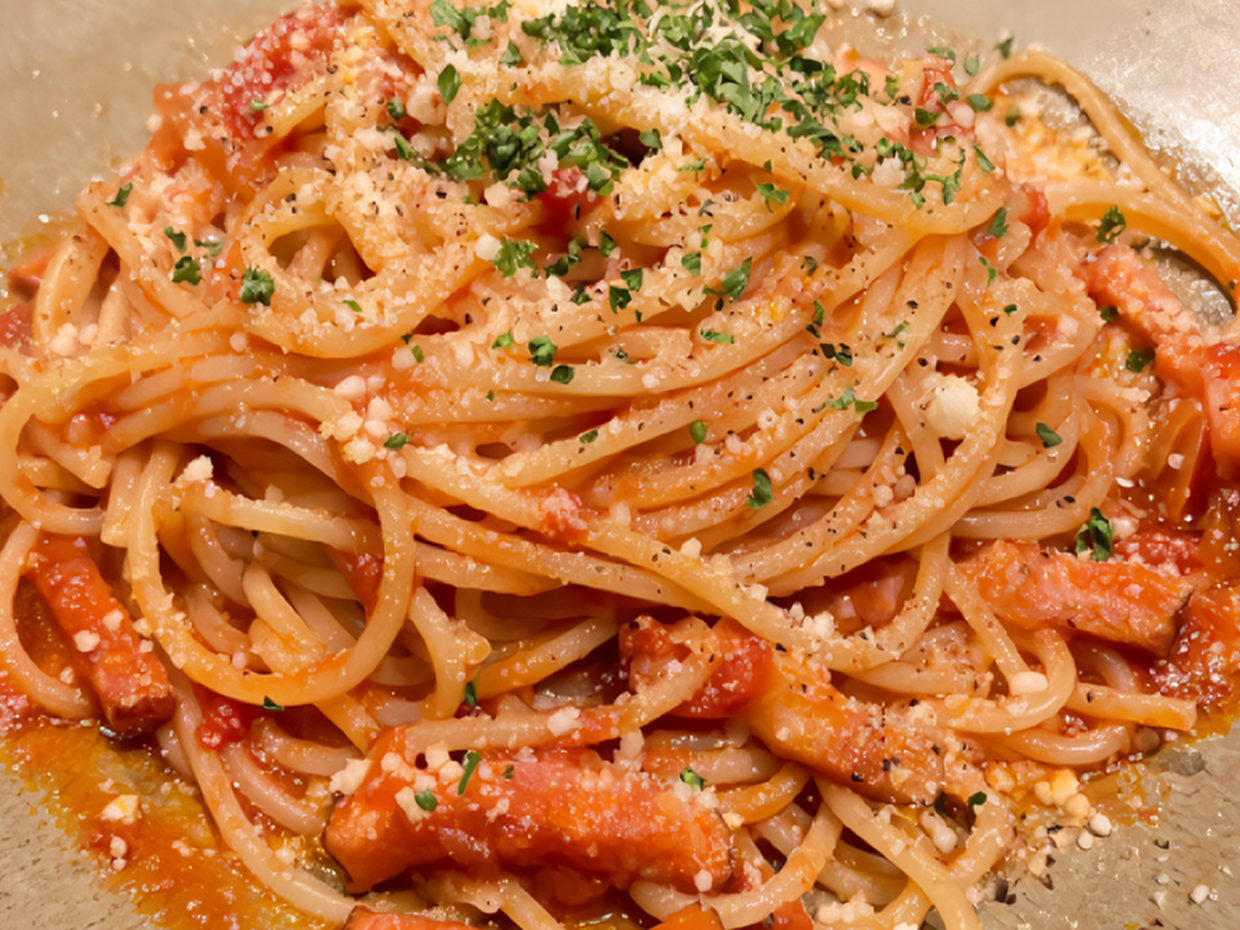 バランスの取れたトマトパスタ: 甘みと酸味のバランスが絶妙な「トマトパスタ」は、お子様でも食べやすいと評判です。