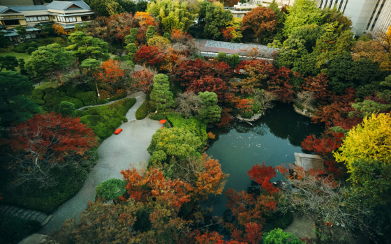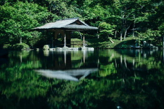 池を中心に配した広大な庭園を歩けば、歩を進めるごとに変化する美しい景色に出会えます。水面に映る緑や歴史的な建物、そして池を泳ぐ色鮮やかな鯉の姿は、訪れる人の心を穏やかに落ち着かせてくれます。