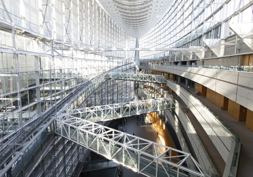ラファエル・ヴィニオリ氏の設計によるこの建物は、巨大な船のような形をしたガラスのアトリウムが特徴です。その美しさは世界的に高く評価され、「ミシュラン・グリーンガイド・ジャポン」で建物全体が二つ星、ガラス棟は三つ星に指定されています。夜にはライトアップされ, 幻想的な空間が広がります。